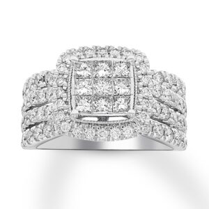 You are ready to spend your lives together, and you want to let the world know. This stunning engagement ring does just that with a frame of round diamonds surrounding three rows of princess-cut diamonds in the center. Awash in more dazzling round diamonds, a generous band of 10K white gold completes the look. The ring has a total diamond weight of 2 carats.